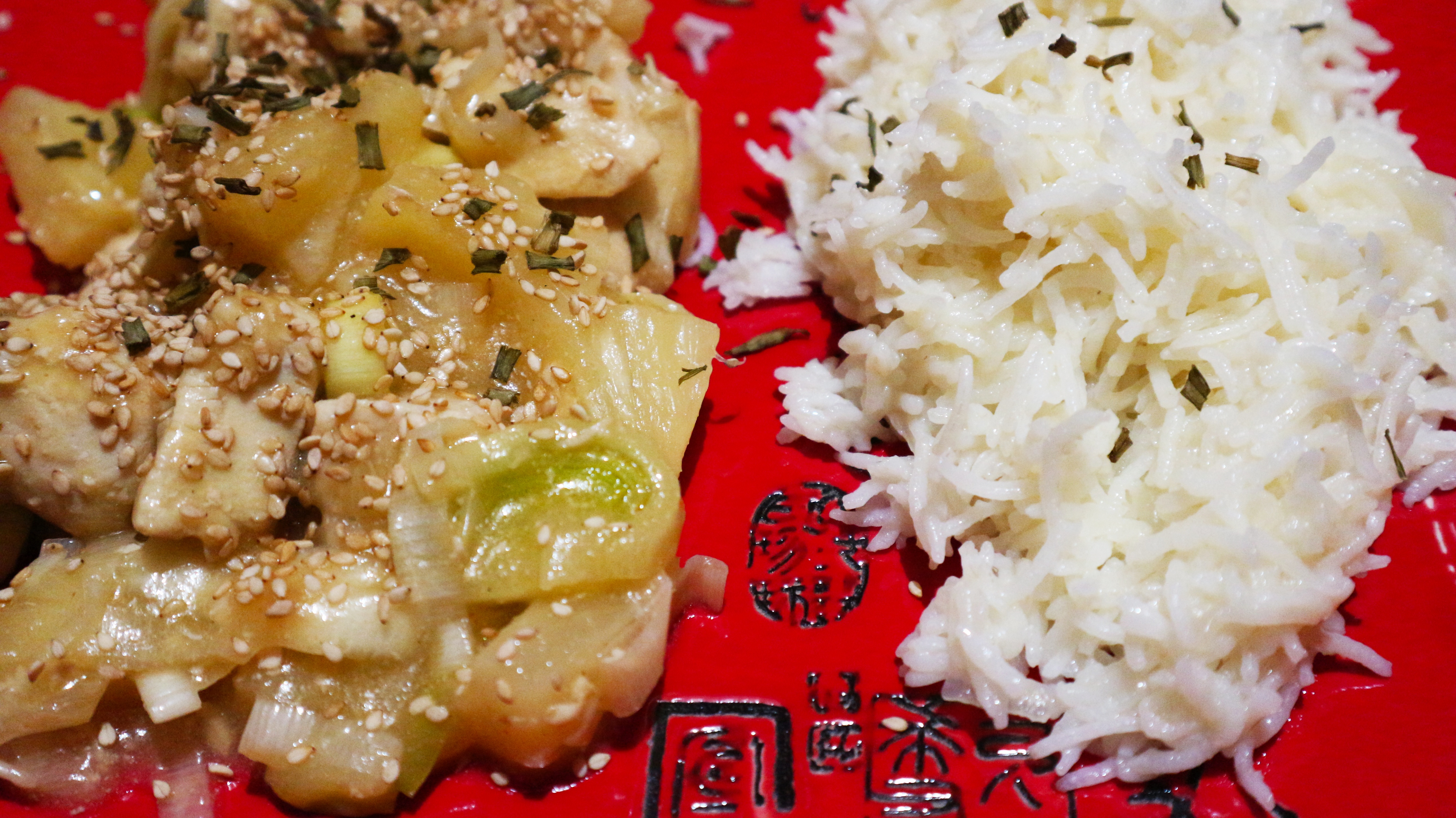 Numa frigideira, salteie o gengibre ralado no azeite, adicione o frango e deixe cozinhar cerca de 4 minutos. Junte o alho-francês, cortado em rodelas, e o ananás cortado em cubos. Envolva tudo. Se necessário, acrescente um pouco de água. Polvilhe com as sementes de sésamo e o cebolinho.