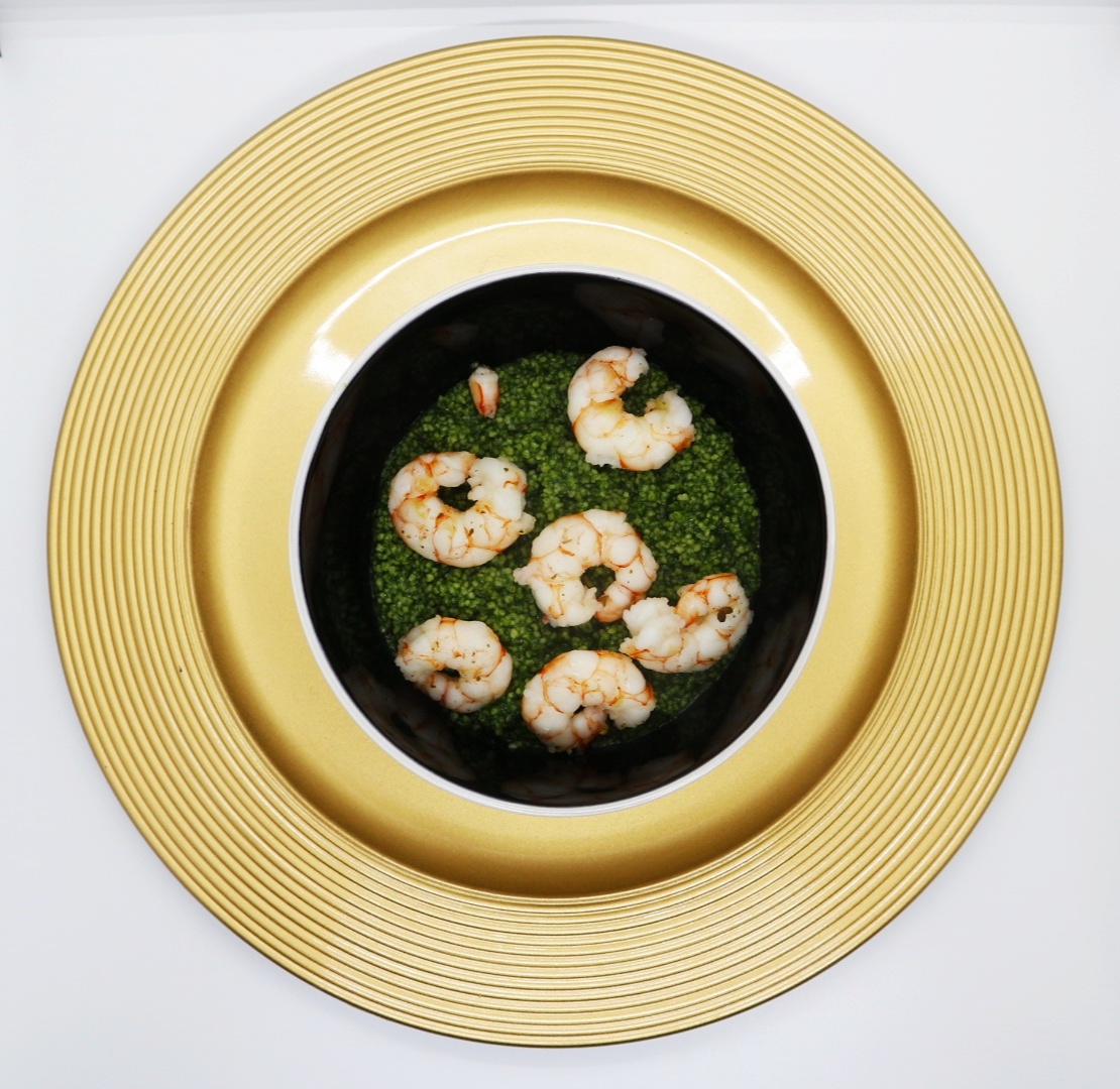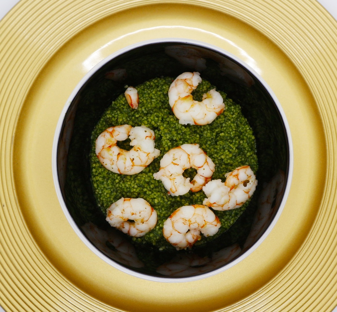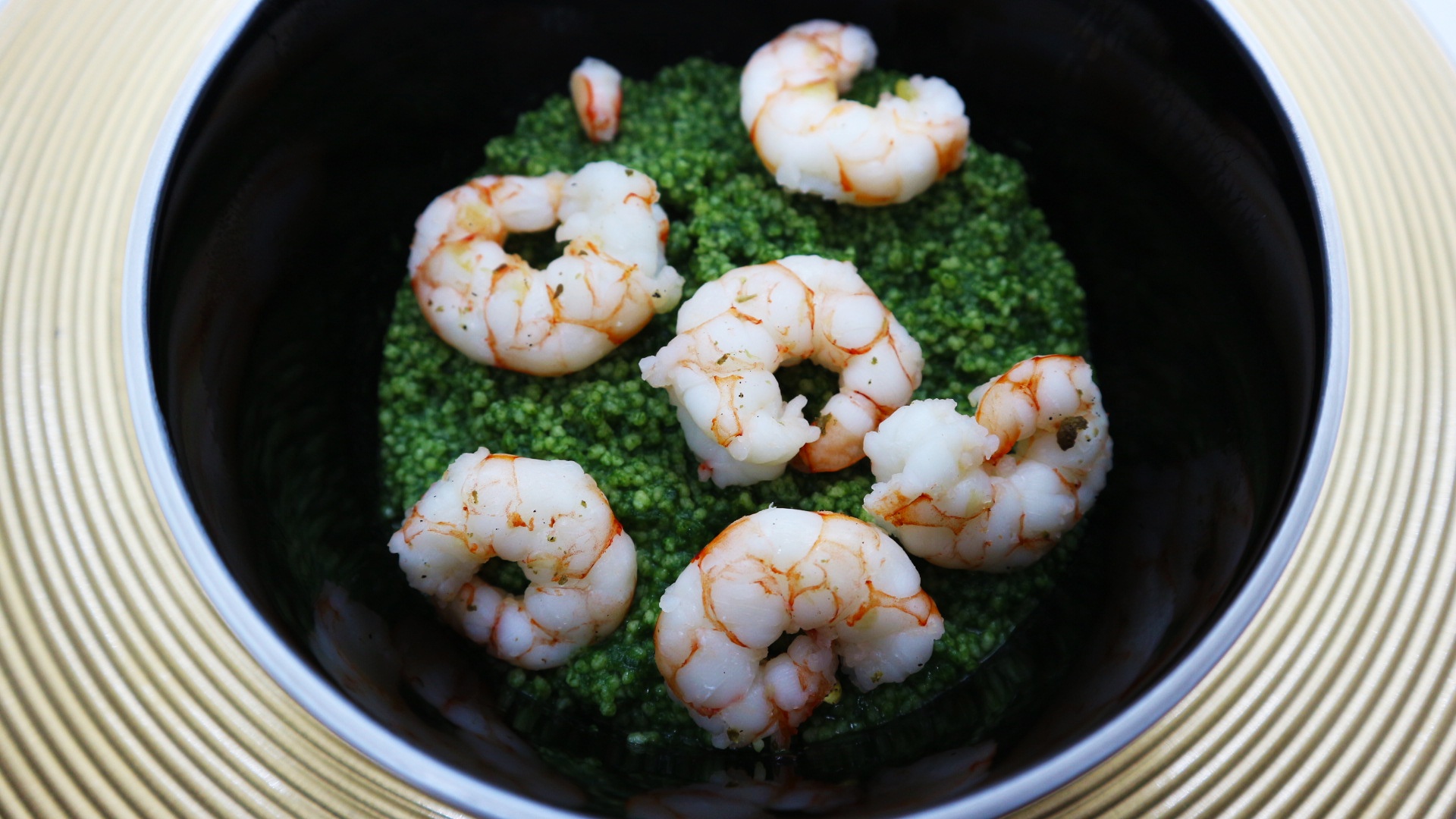 Retire a bandeja de vapor, reserve os camarões e triture os espinafres durante 1 minuto na Velocidade 10.