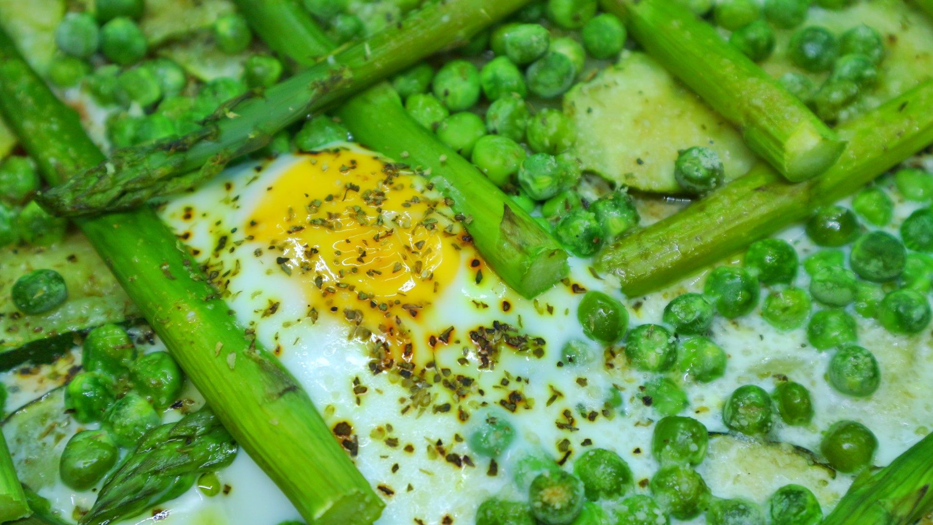 Barre a massa de pizza com o molho de tomate e manjericão. Reserve. Num grelhador untado com um fio de azeite grelhe a curgete cortada em fatias finas longitudinais. Tempere-as com sal e pimenta e disponha-as por cima da pizza. Num tacho com água a ferver escalde os espargos por cerca de 3 minutos. Retire-os e escorra-os bem. Disponha-os em cima da pizza, junte as ervilhas e abra dois ovos no centro. Polvilhe com orégãos e queijo parmesão ralado. Leve ao forno pré-aquecido a 200º C por cerca de 15 minutos.