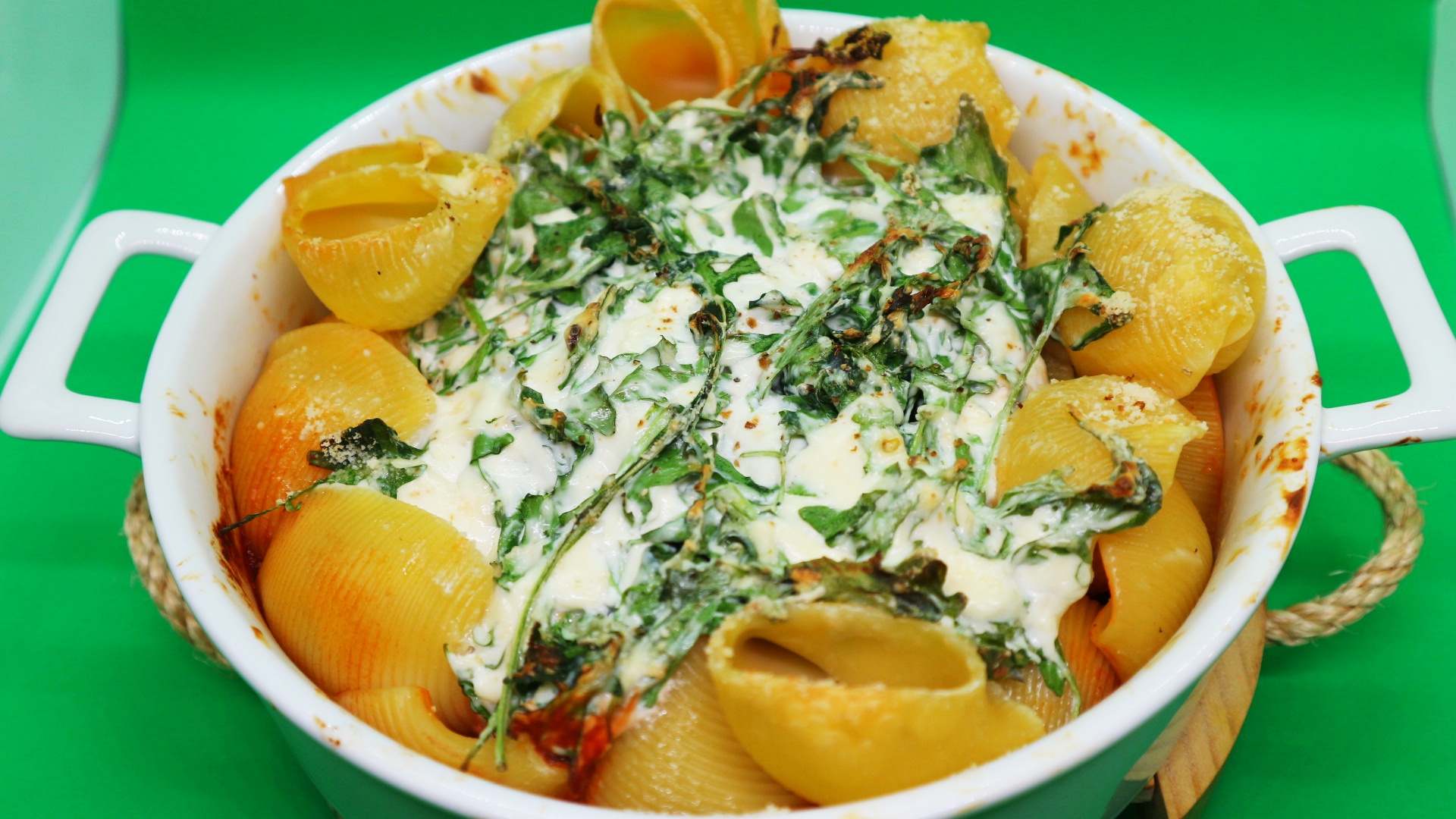 Coloque no fundo de uma travessa o molho de tomate e disponha as conchas. Verta o preparado de queijo e rúcula para cima das conchas. Polvilhe com queijo parmesão e alecrim. Leve ao forno pré-aquecido a 200º C durante 15 minutos.