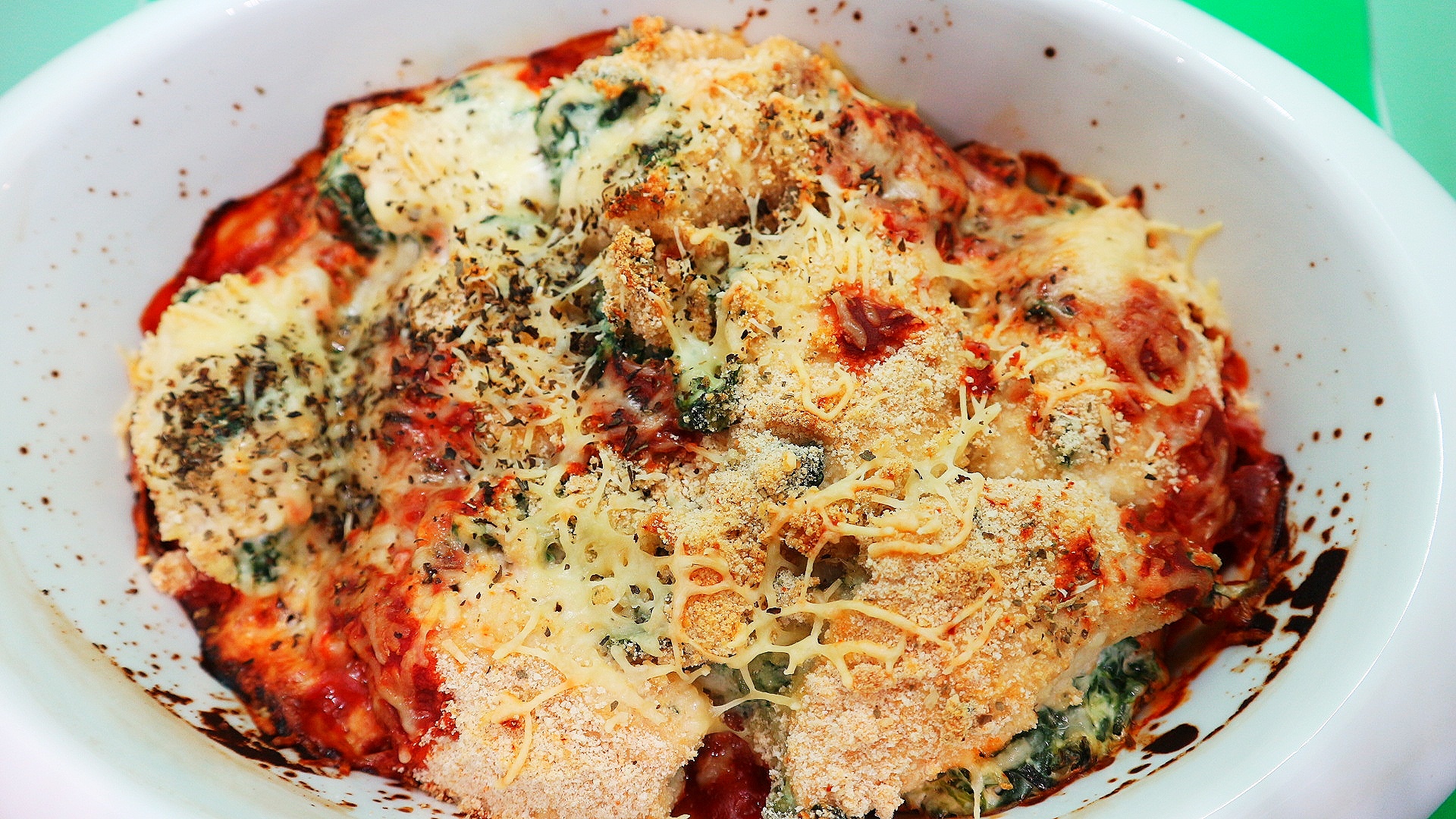 Passe o frango pelas claras e em seguida pelo pão ralado. Ponha os bifes num tabuleiro de forno com um pouco de molho de tomate. Leve ao forno pré-aquecido a 180º C por cerca de 30 minutos.