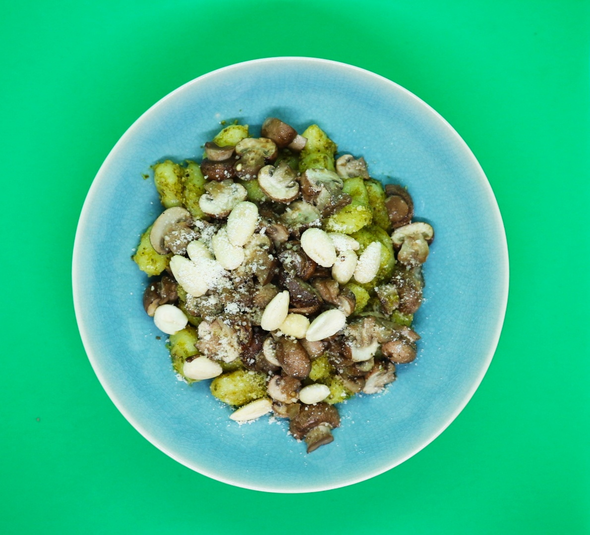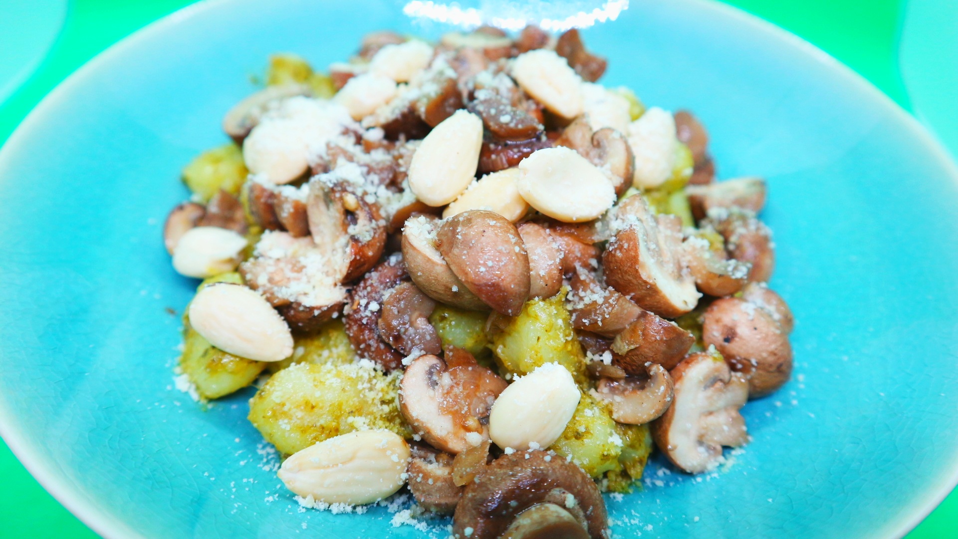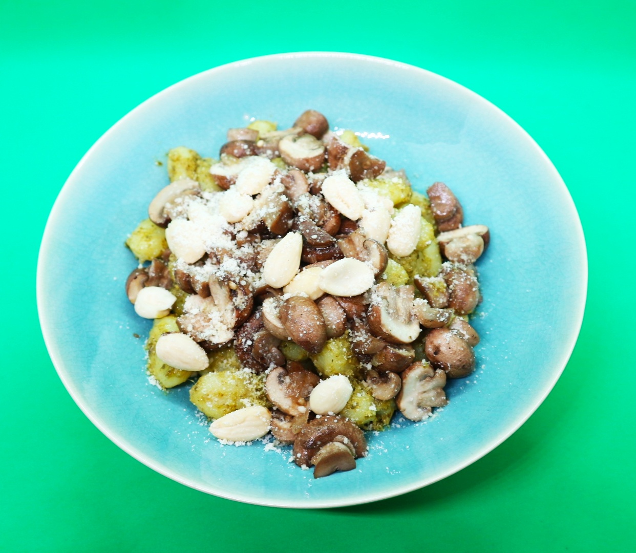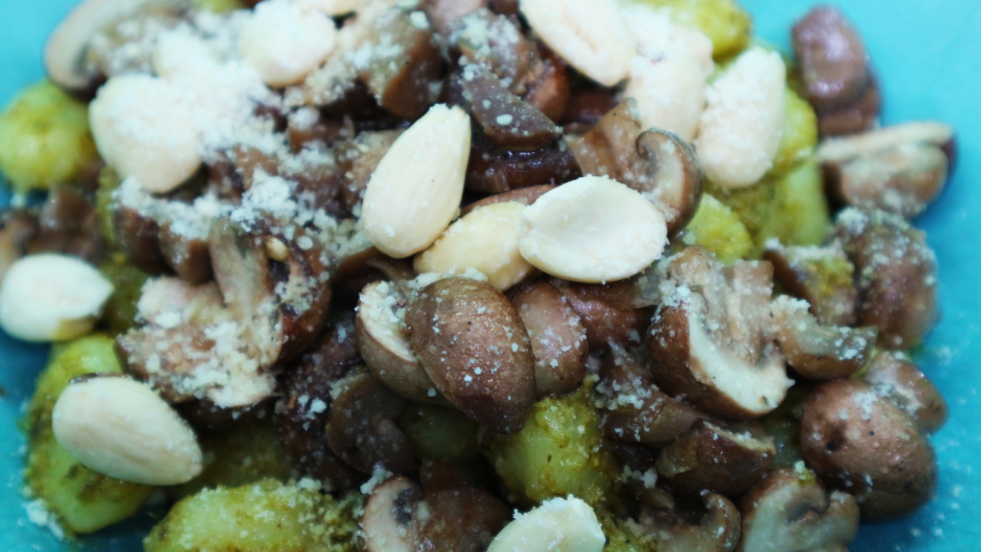 Envolva o molho pesto com os gnocchi cozidos e distribua pelos pratos. Espalhe os cogumelos por cima e salpique com as amêndoas e o queijo ralado.