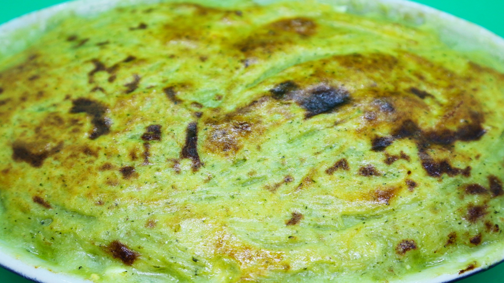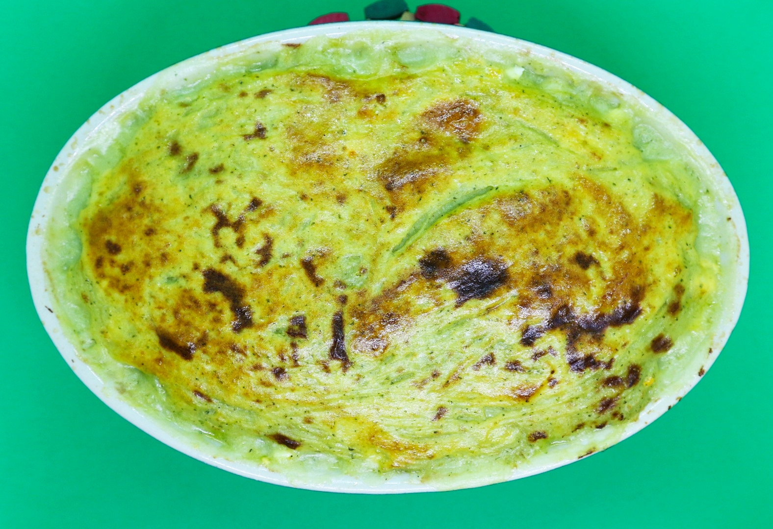 Pré-aqueça o forno a 250º C. Disponha a metade do puré num pirex, cubra com o molho de peixe, o ovo de picado e finalize com o restante puré.