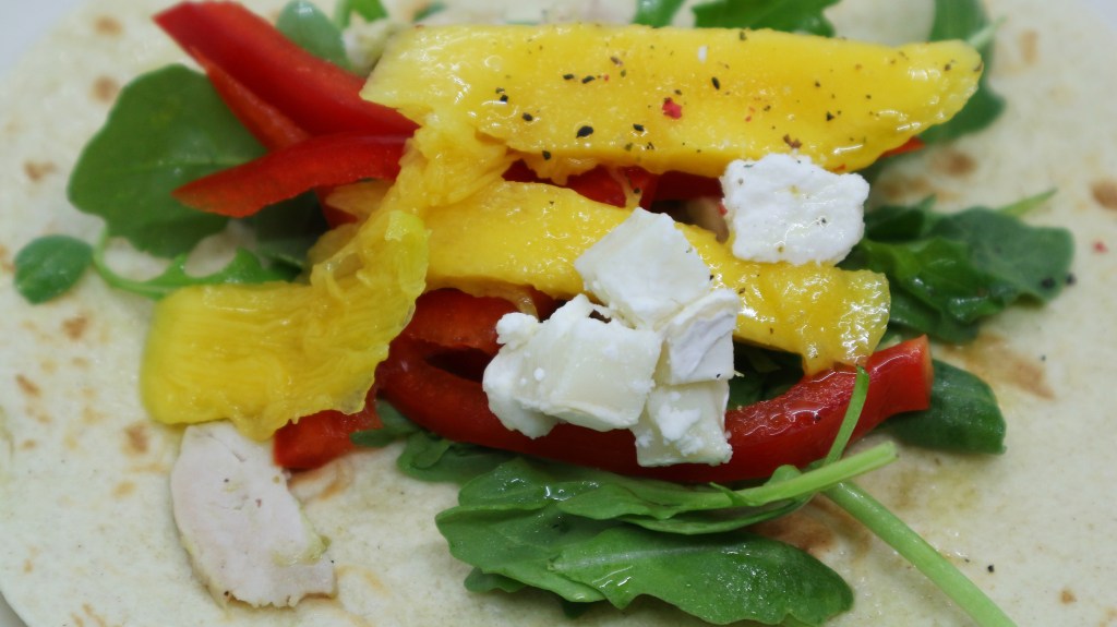 Corte o pimento em juliana. Descasque a manga e corte-a em palitos. Sobre as tortilhas, disponha as folhas de rúcula, o queijo de cabra desfeito em pedaços, a manga e as tirinhas de pimento. Regue com azeite e tempere com sal e pimenta. Enrole as tortilhas. Sirva fresco.
