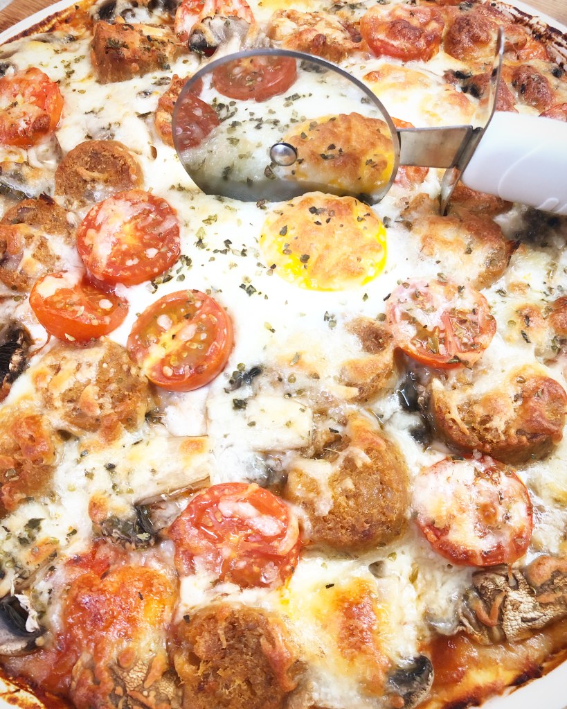 Distribua os cogumelos laminados e os tomates cherry pela base. Adicione a alheira sem a pele cortada às rodelas e o restante queijo ralado. Por fim, acrescente o ovo e polvilhe com orégãos.