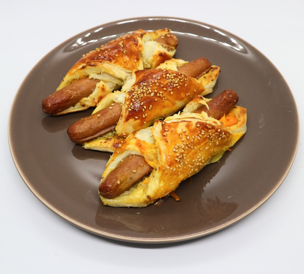 Estenda a massa e corte-a em seis quadrados iguais. Barre a massa com a mostarda. Em cada quadrado de massa, coloque metade de uma fatia de queijo cheddar e uma salsicha. Enrole. Pincele com a gema de ovo batida e polvilhe com as sementes de sésamo. Leve ao forno pré-aquecido num tabuleiro forrado com papel vegetal a 180º C durante cerca de 30 minutos. Sirva com batata frita ou uma salada.
