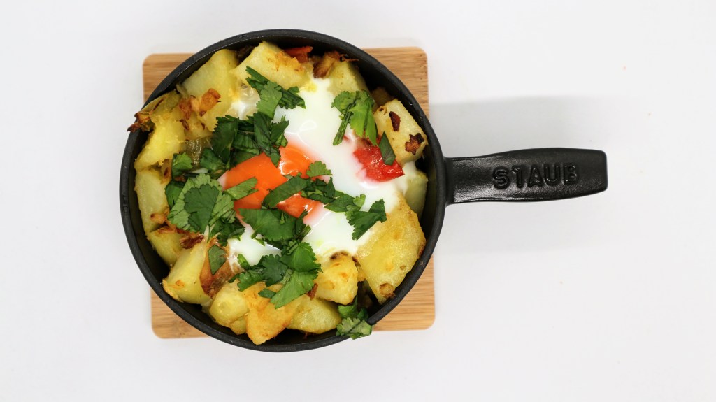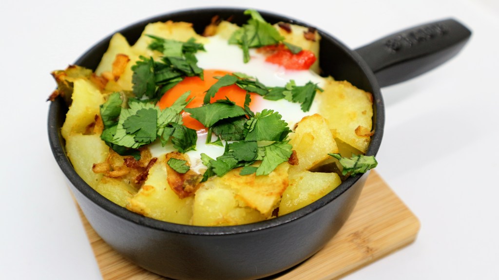 Escorra as batatas e adicione-as à frigideira. Junte as lascas de bacalhau, tempere com o restante sal e pimenta. Abra os ovos por cima e leve ao forno previamente aquecido a 180ºC durante 5 minutos ou até a clara ficar cozinhada e a gema ligeiramente crua. Polvilhe com coentros picados.