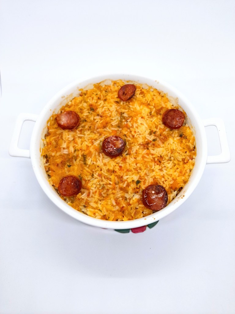 Misture o arroz cozido de sobra com o preparado do copo e transfira-o para uma travessa untada com manteiga. Decore com rodelas de chouriço e leve ao forno pré-aquecido cerca de 20 minutos. Sirva de imediato.