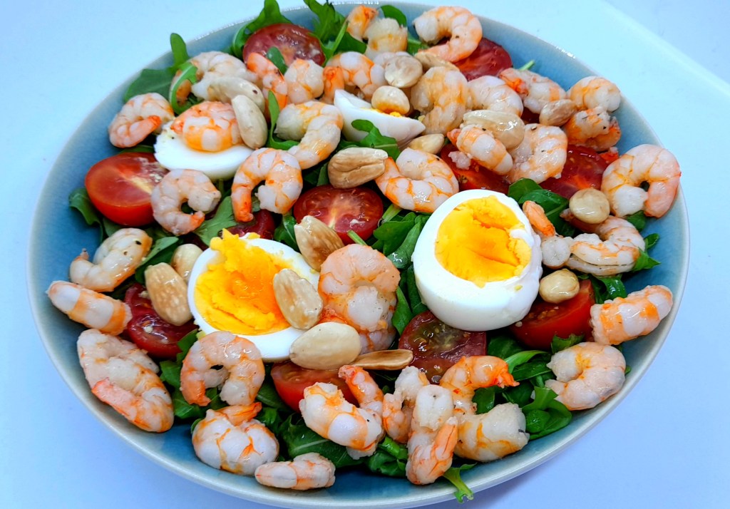 Numa tigela, misture a mostarda, o azeite e o vinagre. Tempere com sal e pimenta e mexa. Junte à rúcula e misture bem. Verta para um prato e, por cima, disponha os camarões, os ovos cozidos e os tomates cherry. Polvilhe com a amêndoa tostada.