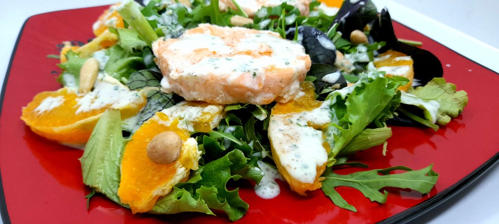 Numa frigideira antiaderente regada com um fio de azeite, grelhe os fisburguers de salmão de ambos os lados. Sirva com uma salada, decore com os gomos de laranja e polvilhe com as amêndoas tostadas. Regue com o molho de gengibre.