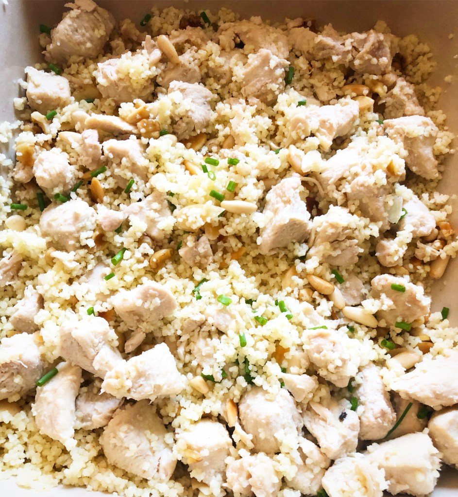 Misture o cuscuz com o frango, adicione os frutos secos e envolva.