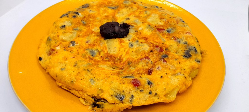 Aos ovos junte a batata cozida e o refogado da morcela.
