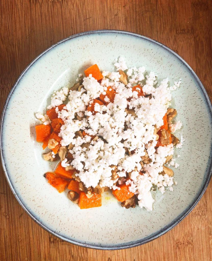 Descasque e retire as pevides da abóbora. Corte-a em cubos. Coloque num tabuleiro e tempere com sal e pimenta. Regue com um fio de azeite. Leve ao forno pré-aquecido a 180º C durante cerca de 25 minutos. Retire, deixe arrefecer um pouco. Polvilhe com as nozes picadas. Com um garfo, esfarele o requeijão e distribua. Tempere com pimenta, orégãos e um fio de azeite. Sirva de imediato.