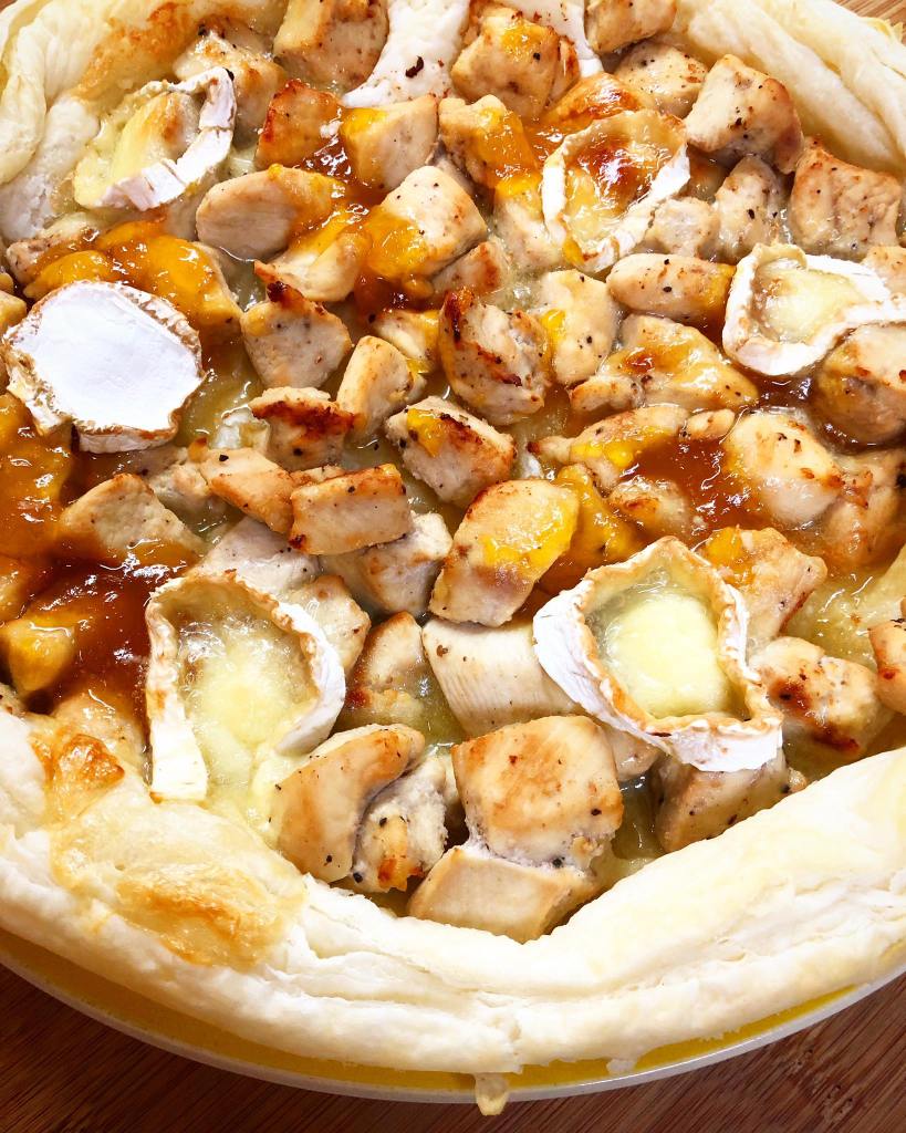Estenda a massa folhada numa tarteira. Coloque por cima o frango, o doce de abóbora e o queijo cortado em rodelas. Leve ao forno pré-aquecido a 185º C por cerca de 20 minutos. Sirva como petisco antes do jantar ou como entrada.
