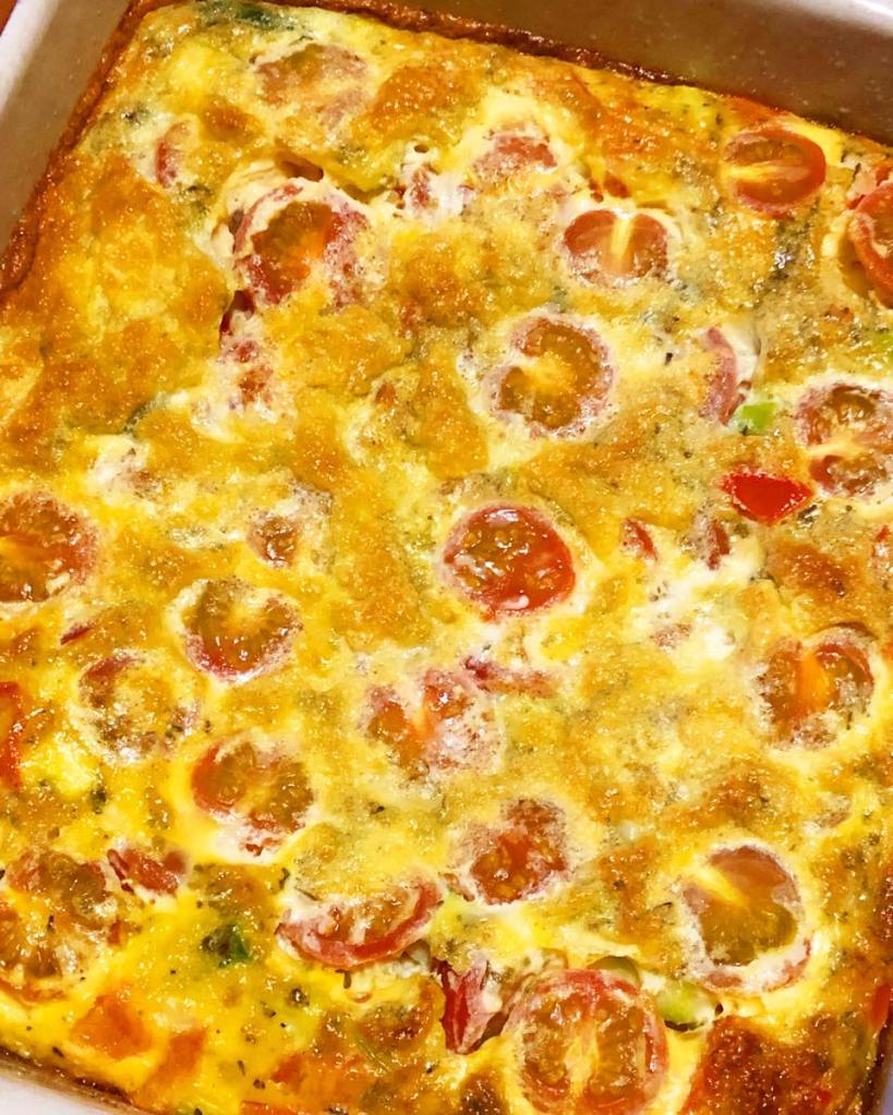 Bata o leite, os ovos e as ervas aromáticas com algumas pitadas de sal e pimenta. Regue os legumes com o leite de ovo. Corte os tomates-cereja ao meio e coloque-os por cima dos restantes legumes. Leve a frittata ao forno durante 30-40 minutos.