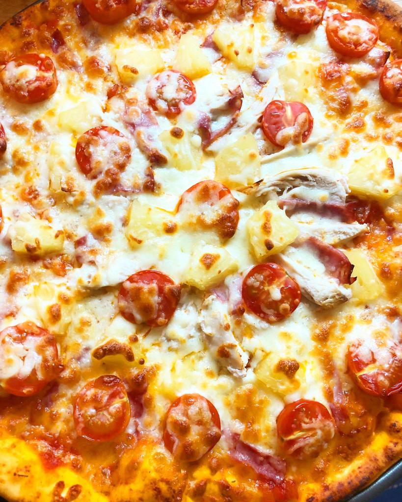 Espalhe o molho de tomate sobre a base da pizza. Polvilhe-o com queijo ralado e disponha o frango, o bacon e o ananás. Polvilhe com mais queijo, azeitonas (opcional) e tomates-cherry. Leve ao forno entre 15 e 20 minutos. Retire e sirva.