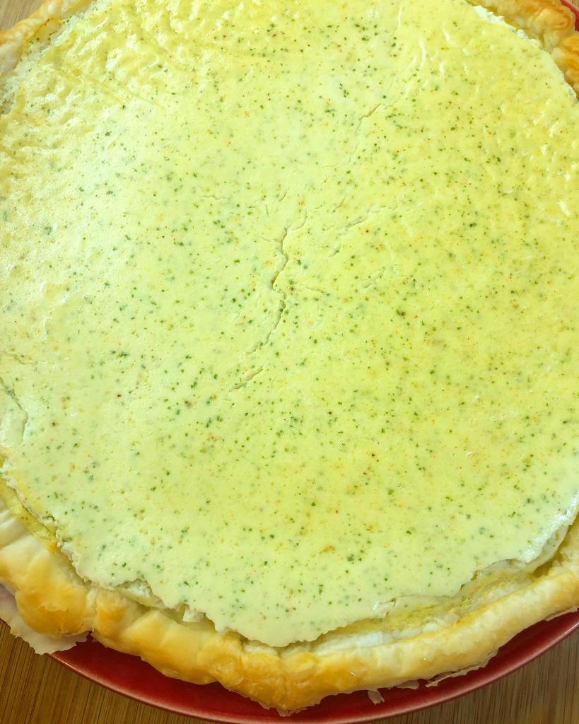 Nesta quiche, optei por usar massa folhada em vez de quebrada, a mais indicada para este tipo de prato. Gostei muito, pois ficou mais estaladiça.