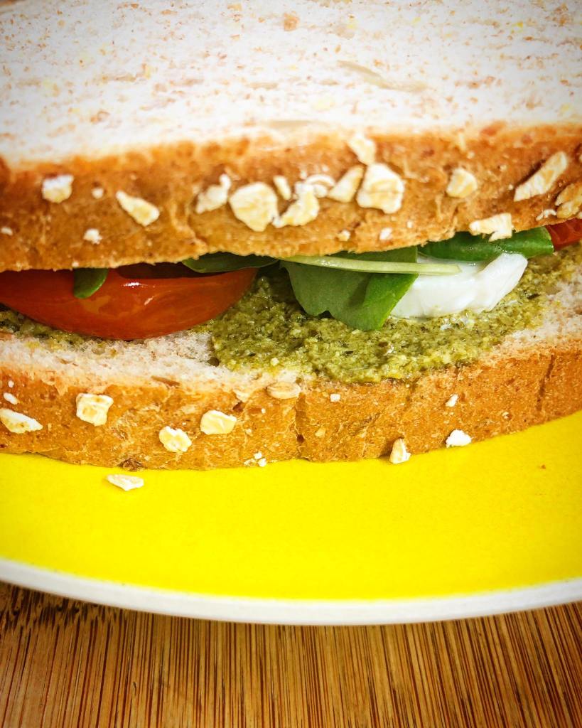 Barre quatro fatias com metade do pesto. Coloque por cima a mozarela em fatias, manjericão, o tomate e a rúcula. Volte a barrar com o restante pesto as outras fatias de pão.