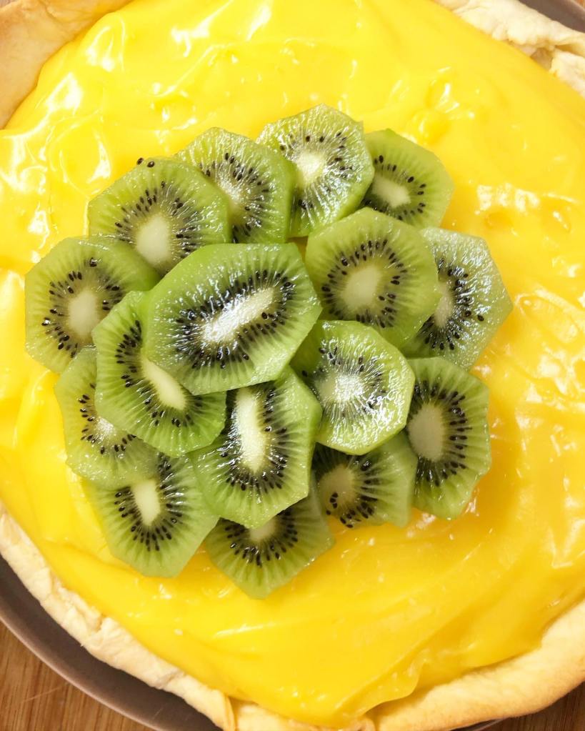 Retire e deixe arrefecer por completo. Decore com os kiwis cortados em rodelas.