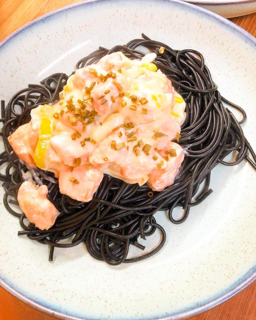 Coza a massa consoante as instruções da embalagem. Escorra e reserve. Corte o salmão e cubinhos e tempere-os com sal, pimenta e a raspa do limão. Aqueça o azeite numa frigideira e core o salmão rapidamente. Retire-o e reserve. Adicione o vinho branco, deixe ferver por 1 minuto e retire-o também. Reserve. Na mesma frigideira, derreta a manteiga e cozinhe os alhos-franceses cortados às rodelas. Tempere com sal e pimenta, junte o vinho branco, as natas, o sumo do limão e a mostarda e envolva. Adicione o salmão e envolva. Sirva com a massa. Polvilhe com cebolinho picado.