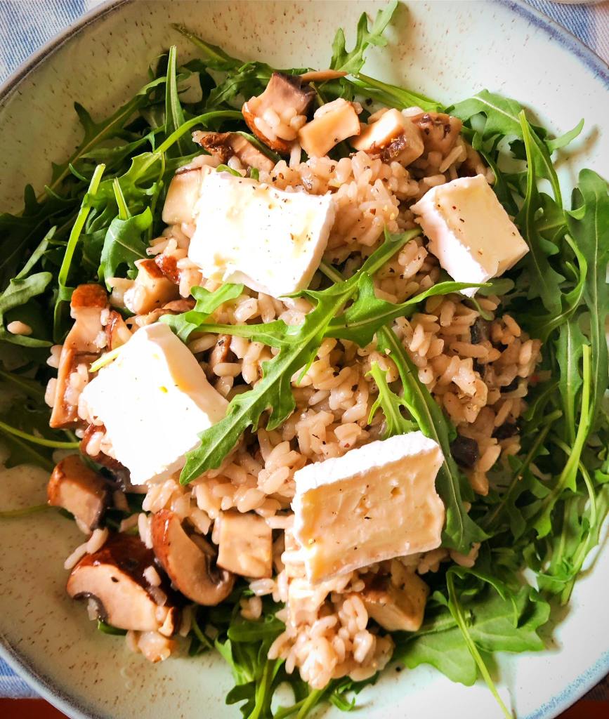 Ferva a água com o sal e adicione-a, pouco a pouco, ao arroz, mexendo à medida que vai sendo absorvida. Assim que o arroz estiver cozido, o que deve demorar cerca de 20 minutos, retire-o do lume, junte-lhe o queijo cortado em pedaços e as folhas de rúcula, e envolva. Tempere com pimenta e sirva.