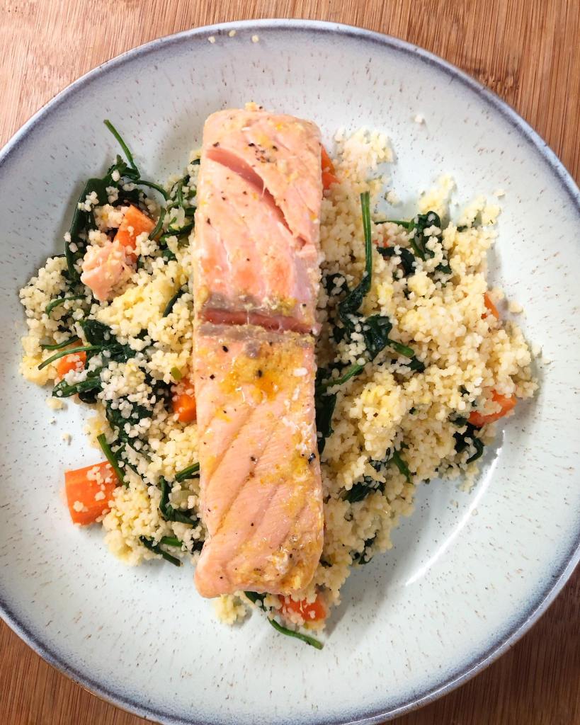 Coza o cuscuz conforme as instruções da embalagem. Junte o cuscuz ao preparado. Adicione os espinafres, o restante sal e deixe cozinhar em lume brando, envolvendo todos os ingredientes.