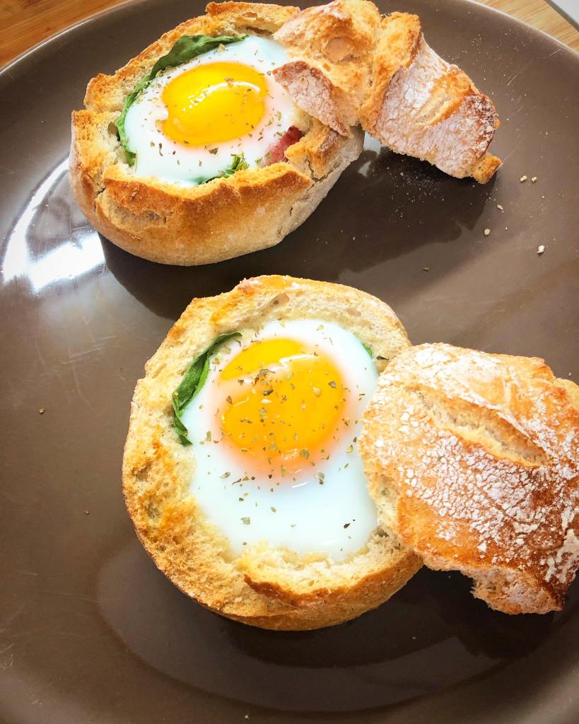 Abra um ovo para dentro de cada pão e tempere com o restante sal e pimenta.