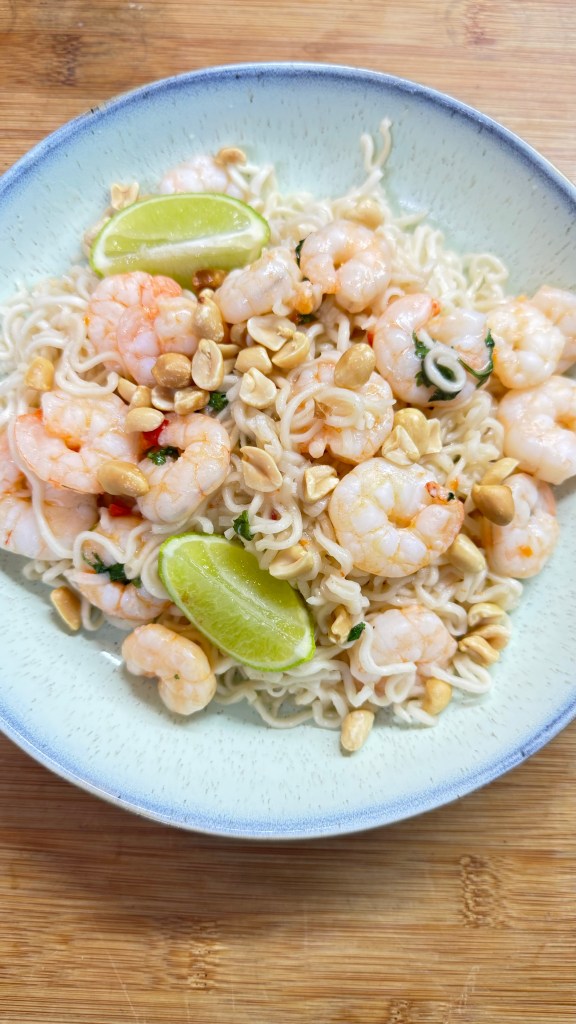 Tempere o camarão com sal, piripiri, o alho e o gengibre e uma colher de sopa de azeite. Cozinhe os noodles seguindo as instruções da embalagem. Escorra-os e reserve. Aqueça o restante azeite numa frigideira e salteie o camarão até ganhar cor. Regue com o sumo de 1 lima, junte os noodles e envolva. Sirva polvilhado com amendoins, as cebolinhas laminadas e a restante lima em gomos.