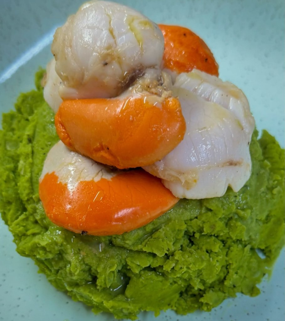 Nem sempre é fácil encontrar receitas interessantes e saborosas de peixe e marisco. Encontrei esta sugestão no livro “Peixe e Marisco, do mar para a mesa”. Adorei a frescura da hortelã no puré de ervilhas e gostei imenso do contraste com o sabor a mar das vieiras.