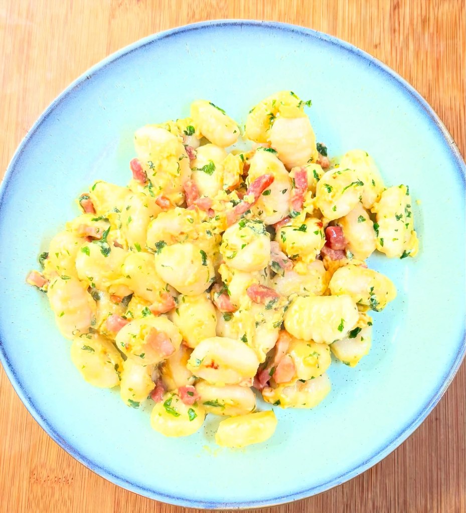 Junte os gnocchi ao bacon. Tempere de sal e pimenta se necessário. Adicione os ovos batidos com as natas e envolva bem. Polvilhe com o queijo ralado. Apague o lume e sirva de imediato.